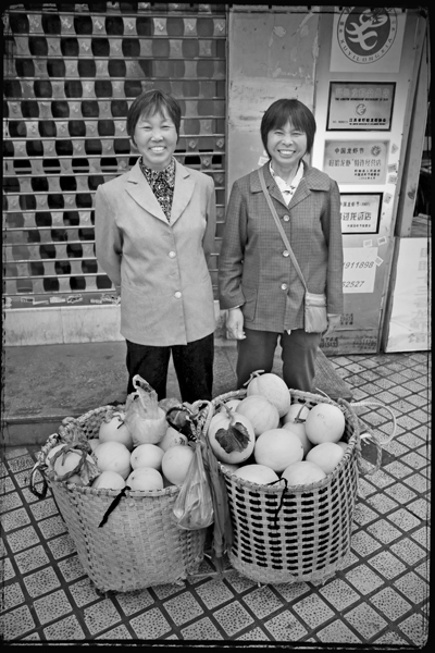 During an early morning walk, in an older neighborhood in Shanghai, I passed these two ladies. Using gestures, I asked if I could take a photograph of them. They blushed and seemed flattered, but they indicated with gestures of their own that they did not want their photograph taken. My practice is to always honor such requests. Later that morning, on my way back through the neighborhood, I saw the ladies again. We recognized one another. I again indicated that I would like to take their photograph. This time, they hesitated briefly, then they agreed. They posed for this photograph behind their baskets of melons. The lady on the right held up her hand and asked me to wait before I took the photograph. She then buttoned the top button on her blouse. They were as dignified as they were gracious.